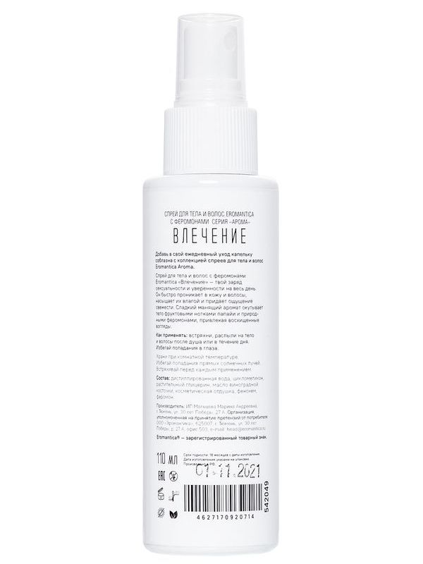 Eromantica Attraction Vücut ve Saç Spreyi ile çekiciliğinizi vurgulayın, enerjinizi artırın ve güzellikteki anları öne çıkarın. Kendinizi özel hissetmek için mükemmel bir tamamlayıcıdır.